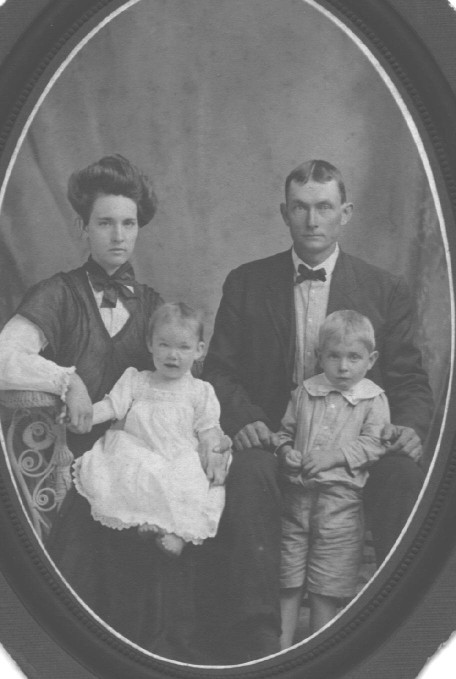 William David Simmons (W.D.) and Mary Eviline Barker (Evie), with their oldest son Lloyd Henry (standing with his father) and their second son, Thomas Edward (my father) as a baby on his mothers lap. Circa 1907 Submitted by Herb Simmons ← |
