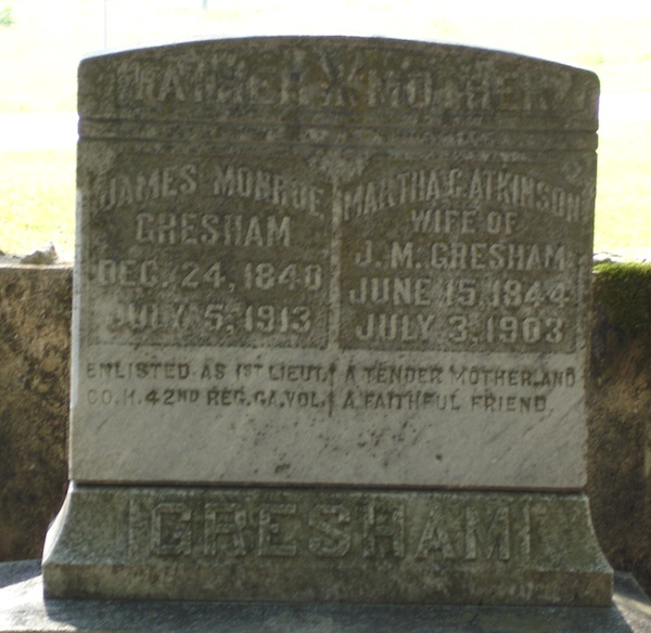 James Monroe Gresham (24 Dec 1840 – 8 Jul 1913) was the son of William Gresham and Mary Eleanor Stroud. His tombstone notes that he served as a First Lieutenant of the CSA Co H, 42nd Regiment Infantry ("Walton County Tigers") enlisting on 4 March 1862. He was a prisoner at Johnson's Island, Ohio and was released on oath on or after 9 Apr 1865; final date 16 Jun 1865.