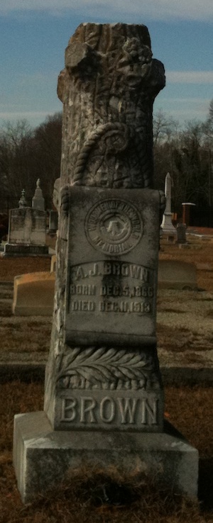 A. J. Brown was married to Lena Gresham (daughter of James Monroe Gresham). She is buried in West View Cemetery, Fulton County in Atlanta, Georgia. After he died she moved with their two daughters to Atlanta and lived on Adair Street until her death in 1952.
