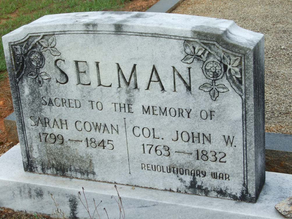 John W. Selman, according to his headstone at Bethel Church in Good Hope, Walton County, Georgia, was born in 1763 and died in 1832. He shares a headstone with his wife (Elizabeth) Sarah Cowan born 1799, died 1853. Some records show a date of birth as 1776 and date of death at 1829. His birth place is consistently shown at Stafford, Virginia.