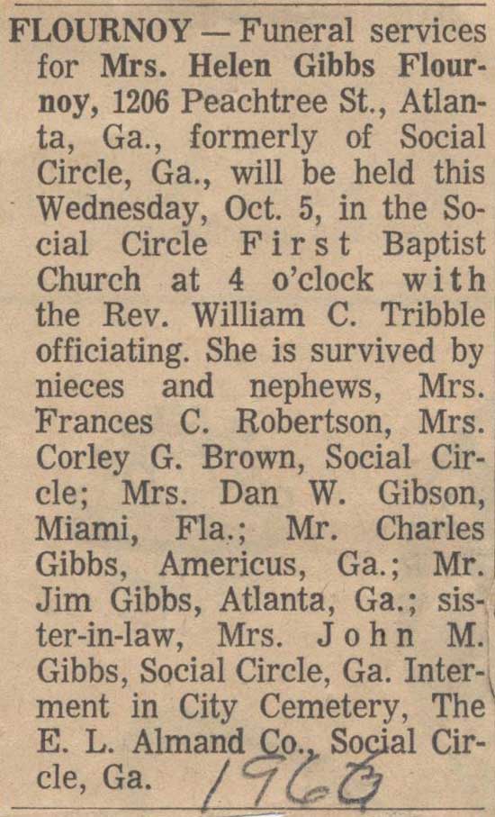 FLOURNOY — Funeral services for Mrs. Helen Gibbs Flournoy, 1206 Peachtree St., Atlanta, Ga., formerly of Social Circle, Ga., will be held this Wednesday, Oct. 5, in the Social Circle First Baptist Church at 4 o'clock with the Rev. William C. Tribble officiating. She is survived by nieces and nephews, Mrs. Frances C. Robertson, Mrs. Corley G. Brown, Social Circle; Mrs. Dan W. Gibson, Miami, Fla.; Mr. Charles Gibbs, Americus Ga.; Mr. Jim Gibbs, Atlanta, Ga.; sister-in-law Mrs. John H. Gibbs, Social Circle, Ga.; Interment in the City Cemetery, the E. L. Almand Co., Social Circle, Ga.