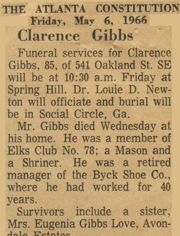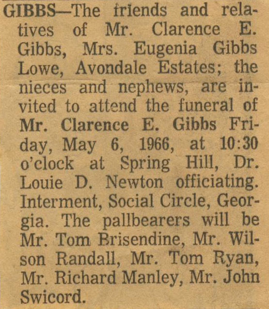 GIBBS—The friends and relatives of Mr. Clarence E. Gibbs, Mrs. Eugenia Gibbs Lowe, Avondale Estates; the nieces and nephews are invited to attend the funeral of Mr. Clarence E. Gibbs Friday, May 6, 1966, at 10:30 o'clock at Spring Hill, Dr. Louie D. Newton officiating. Interment, Social Circle, Georgia. The pallbearers will be Mr. Tom Brisendine, Mr. Wilson Randall, Mr. Tom Ryan, Mr. Richard Manley, Mr. John Swicord.