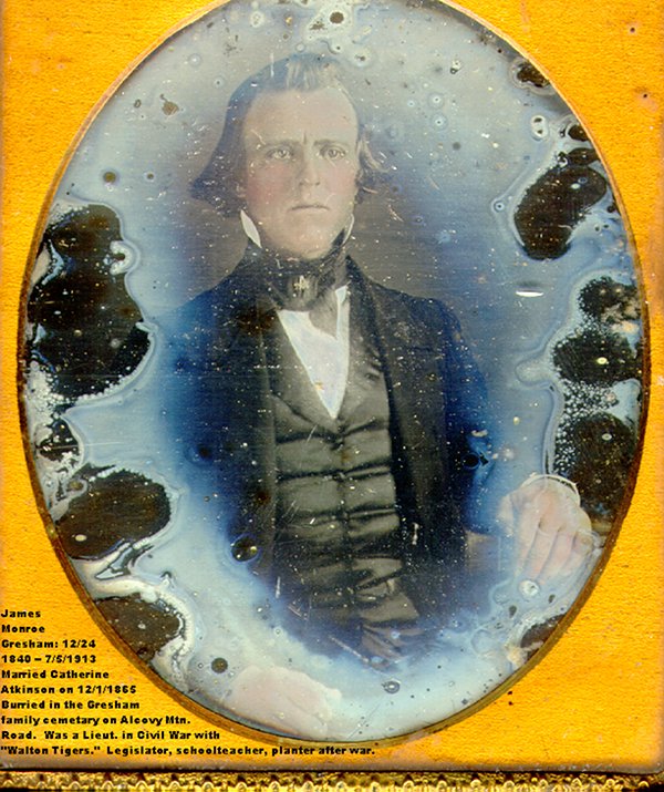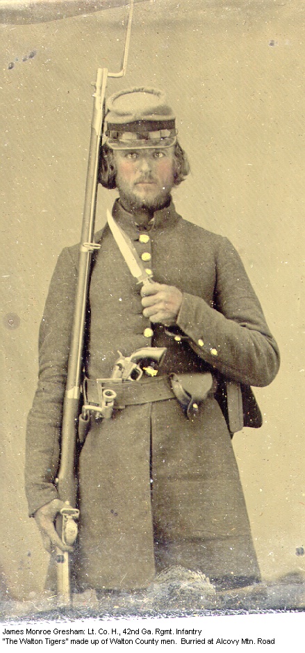 James Monroe Gresham (24 Dec 1840 – 8 Jul 1913) was the son of William Gresham and Mary Eleanor Stroud. His tombstone notes that he served as a First Lieutenant of the CSA Co H, 42nd Regiment Infantry ("Walton County Tigers") enlisting on 4 March 1862. He was a prisoner at Johnson's Island, Ohio and was released on oath on or after 9 Apr 1865; final date 16 Jun 1865.