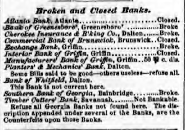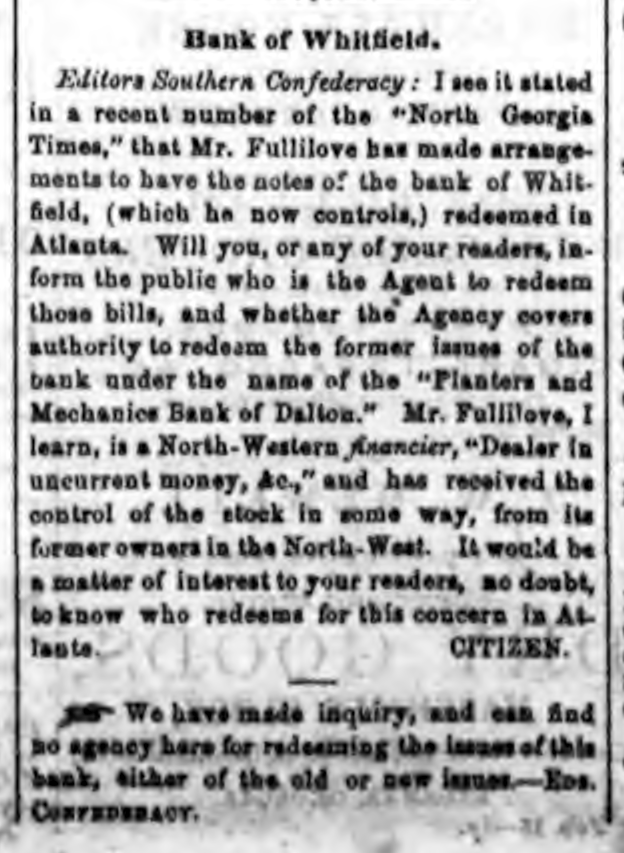 Mentions Cherokee Insurance and Banking Co of Dalton, Bank of Whitfield, Dalton and Planters and Mechanics Bank, Dalton