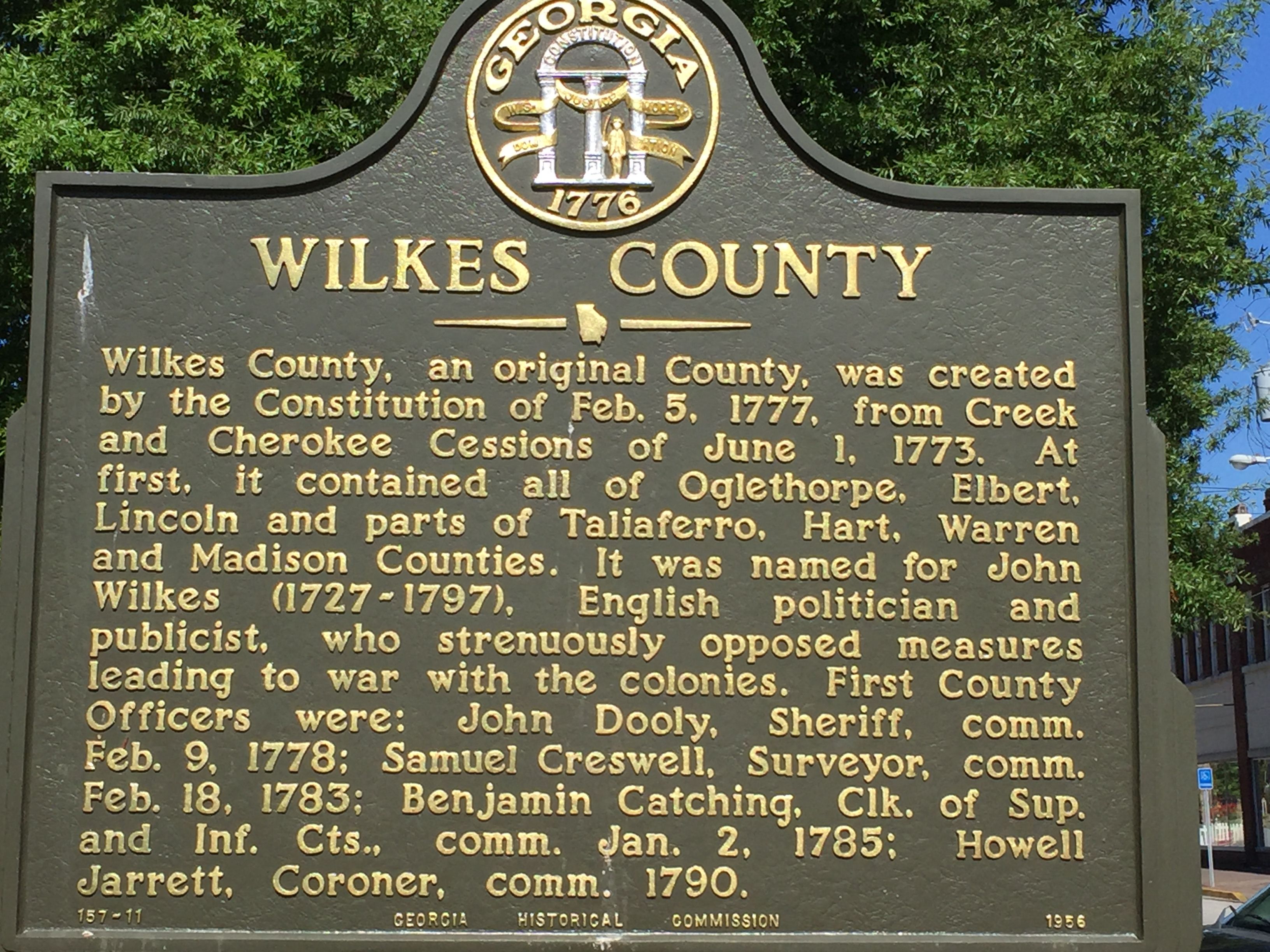 Wilkes County, an original County, was created by the constitution of Feb. 5, 1777 from Creek and Cherokee Cessions of June 1, 1773. At first, it contained all of Oglethorpe, Elbert, Lincoln, and parts of Taliaferro, Hart, Warren, and Madison Counties. It was named for John Wilkes (1727-1797), English politician and publicist, who strongly opposed measures leading to war with the colonies. First County Officers were: John Dooly, Sheriff, comm. Feb. 9, 1778; Samuel Creswell, Surveyor, comm. Feb. 18, 1783; Benjamin Catching, Clk. of Sup. and Inf. Cts., comm. Jan. 2, 1785; Howell Jarrett, Coroner, comm. 1790.
