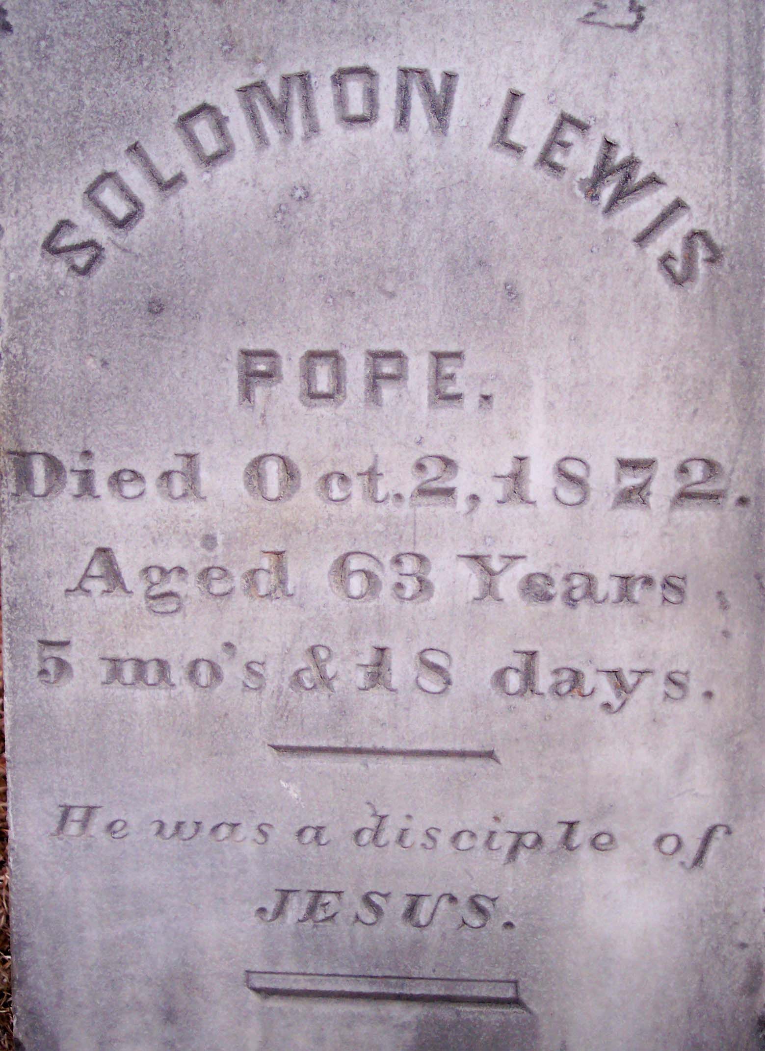 next was Joanna’s husband, Solomon Pope, who died in 1872 at age 63. Solomon