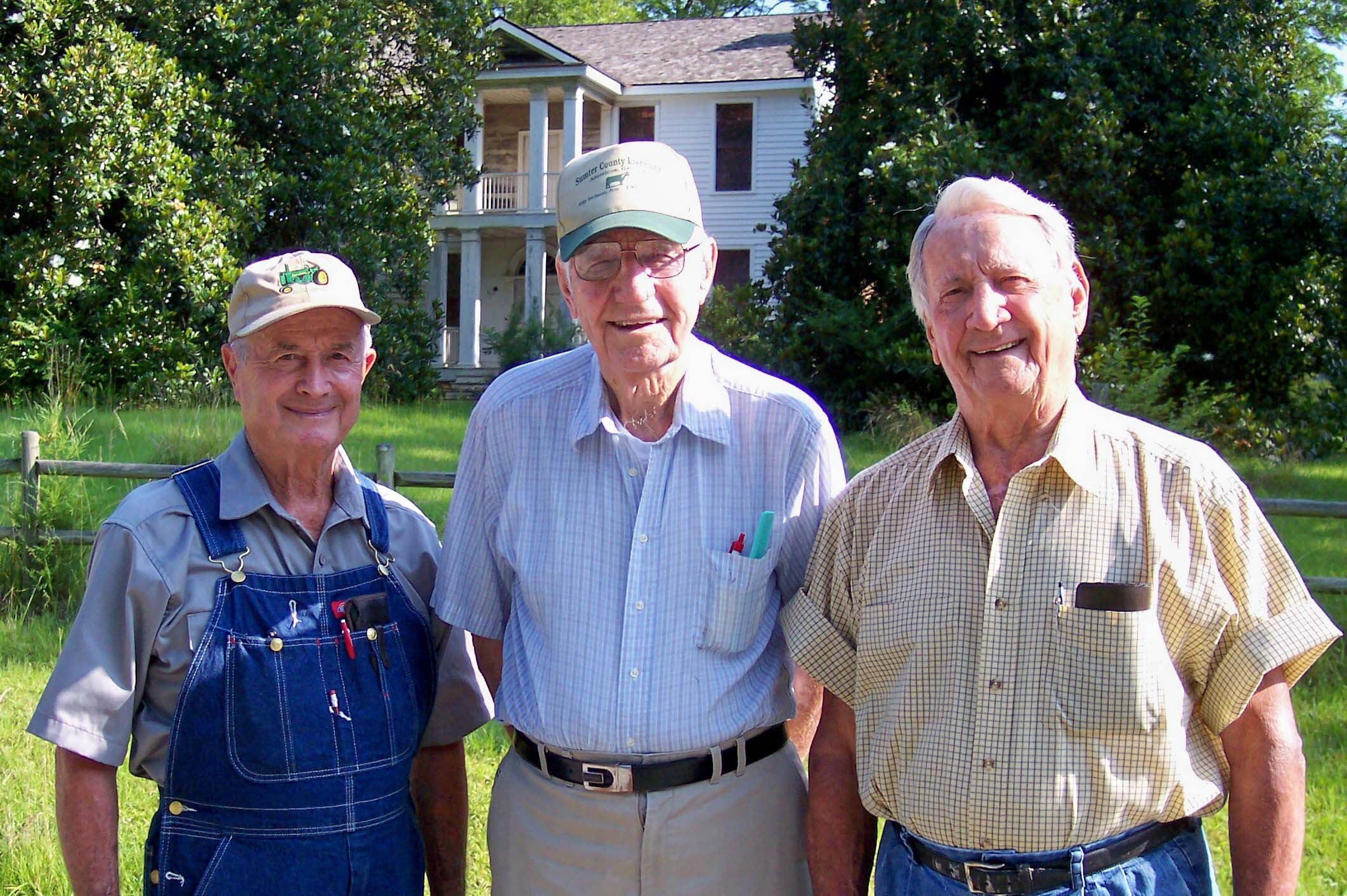 The "Oak Grove Gang" pictured in front of the 1823 Williams Home at Robley. L-R are Charlie Frank Harris, Paul Spillers, and Billy Harris. |