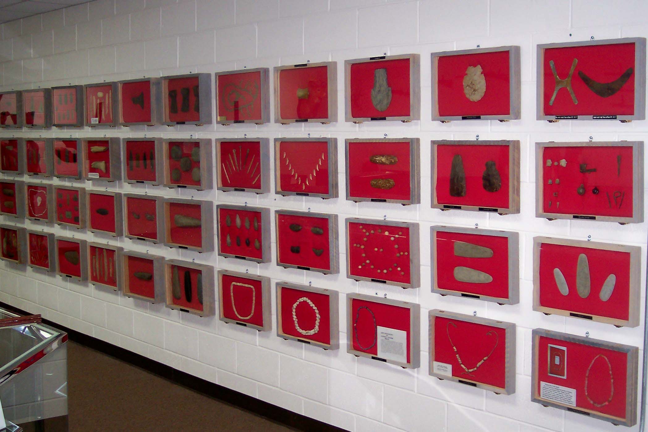 Neatly arranged in glass display cases are over 180 pieces of Indian