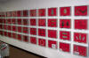 are orderly arranged inside glass-enclosed frames that hang on the museum