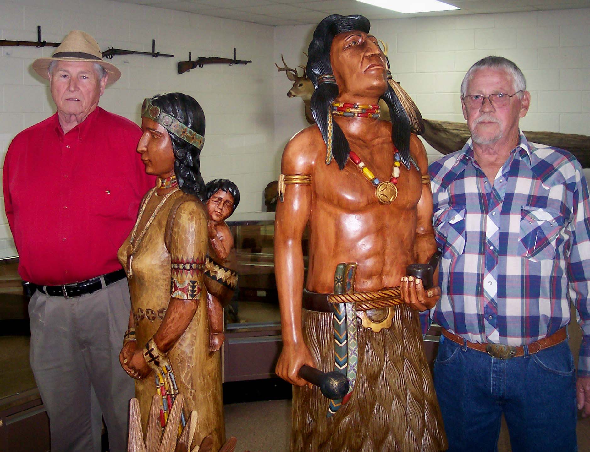 Earl Amerson (L) and Wayne Myers (R) with carved Indian statues. |