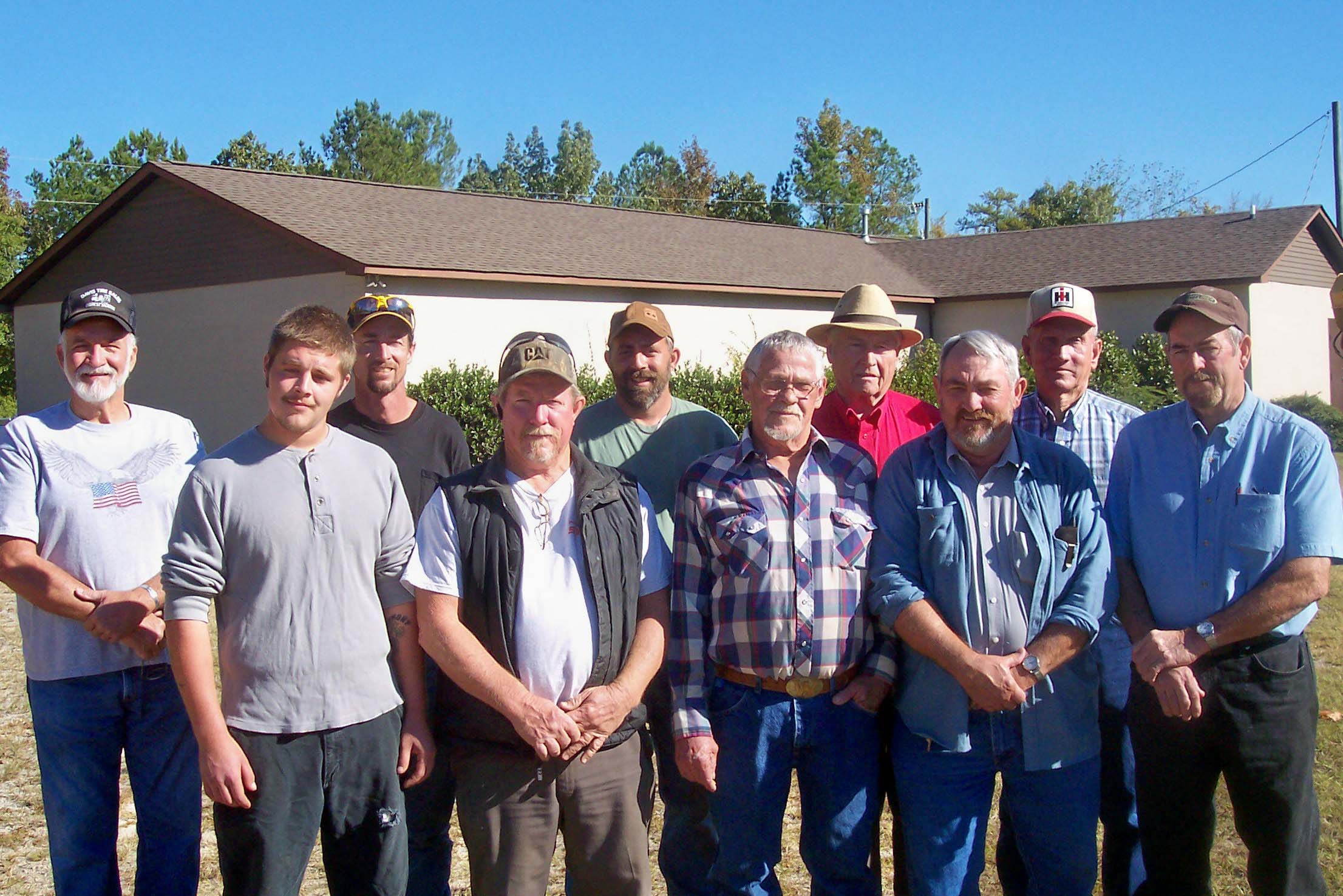 Stokes family and friends gather outside the Southeastern Indian Museum on Julia Jordan Road. Front row, L-R: Austin Stokes, Jerry Stokes, Wayne Myers, Mike Stokes, Larry Stokes. Back row, L-R: Cary Stokes, Larry Stokes Jr., Mike Stokes Jr., Earl Amerson, Jimmy Stokes. |