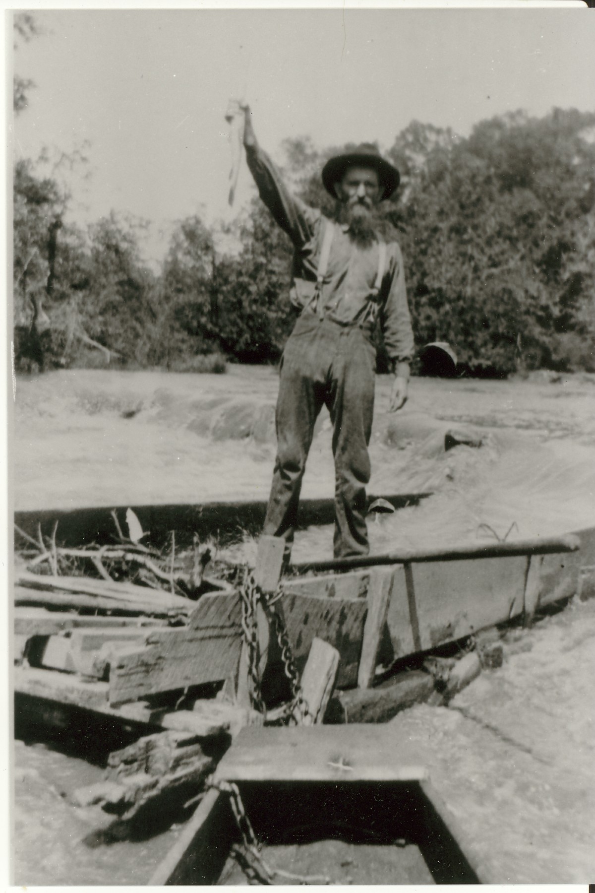 This is a picture of Ethan Wayne Reeves, Sr., a son of James Milton Reeves, standing on his fishtrap in the Flint River in the early 1900's. Ethan is holding up a fish in his right hand. The wooden fishtrap was built at the location of an old rock fish trap originally constructed by an Indian tribe which once inhabited this region. The picture was given to me by a descendant of Ethan Wayne Reeves.