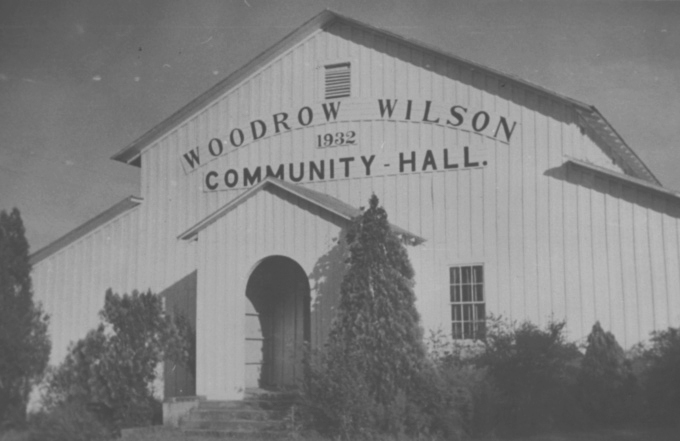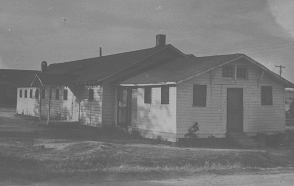Appears to have the congregation standing across the front-probably 50+ people. It has a sign above the door "White Water" - and underneath the big sign are [what appears to be in chalk] the words (as best as I can make out with a magnifying glass): High School SJG Prin.