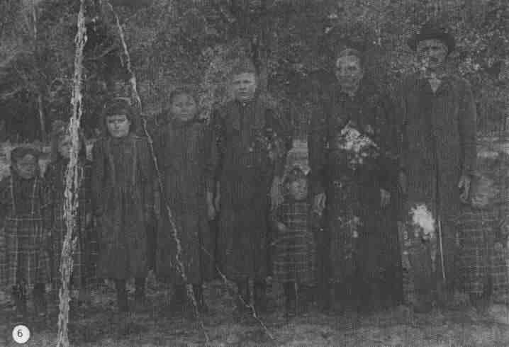 6. Seven Oldest Siblings. L-R: Minnie, Almeda, Agnes, Rosa, Callie, Mattie, Sarah (mother), George (father), George. ca. 1896. (Jean S. Martin)