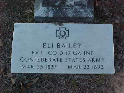 ![]() ELI BAILEY son of William & Mary Bailey b. 23 Mar 1837 d. 22 Mar 1892 According to Carol Bailey Burnham , Eli's wife, Caroline Cannon Harris Bailey is buried next to Eli in an unmarked grave - b. 01 Mar 1838 d. Sept 1925; |