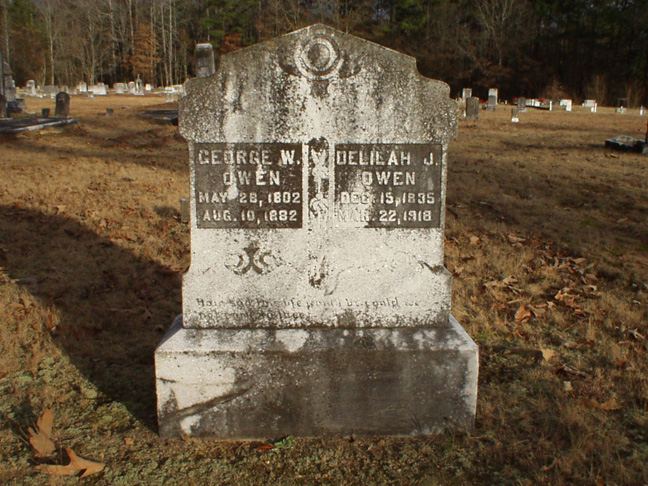 GEORGE WASHINGTON OWEN b. 28 May 1802 d. 10 Aug 1882 DELILAH JANE WARD (Daughter of Miles Ward & Linea "Linny" McLean) b. 15 Dec 1835 d. 22 Mar 1918 *According to info submitted by Patricia Griggs Stricklin on these families, George & Delilah Owens' daughter, Nannie L. Owen, b. ca 1865 d. after 1905, married Jefferson Davis Cobb, son of Leroy M. Cobb, They are both buried here in unmarked graves. They were married on 25 Nov 1883 in Fayette Co., GA. |