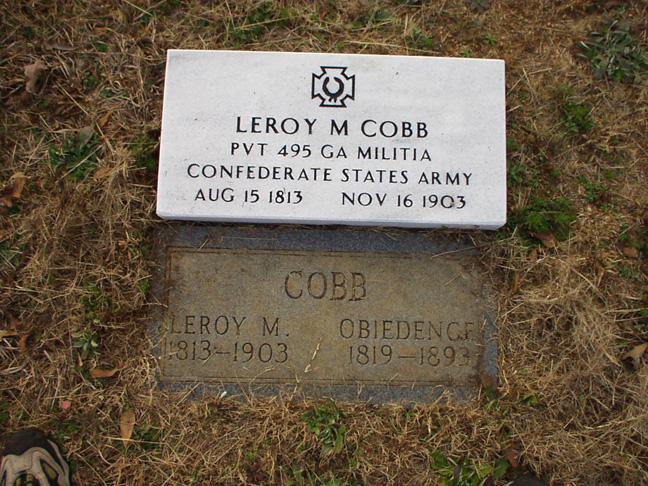 LEROY M. COBB 1813 - 1903 OBEDIENCE ROBINSON COBB 1819 - 1893 LEROY M. COBB & OBEDIENCE ROBINSON WERE MARRIED ON 11 MAY 1837 IN FAYETTE COUNTY, GA |