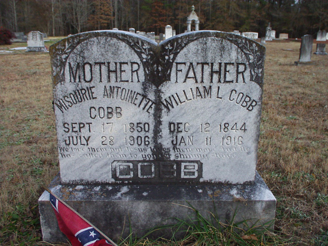 MISSOURI ANTOINETTE KENADY AND WILLIAM L. COBB Wm. L. Cobb, son of Leroy M. & Obedience Robinson Cobb M. A. Kenady & W. L. Cobb were married 30 Dec 1874 in Fayette Co., GA Missouri, b. 17 Sept 1850 d. 28 July 1906 William L., b. 12 Dec 1844 d. 11 |