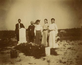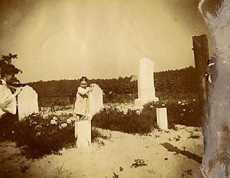 Photo taken circa 1906 at Woolsey Cemetery Lewis Clinton & Mollie Bridges McLean at the grave of their daughter, Lutie L. McLean |