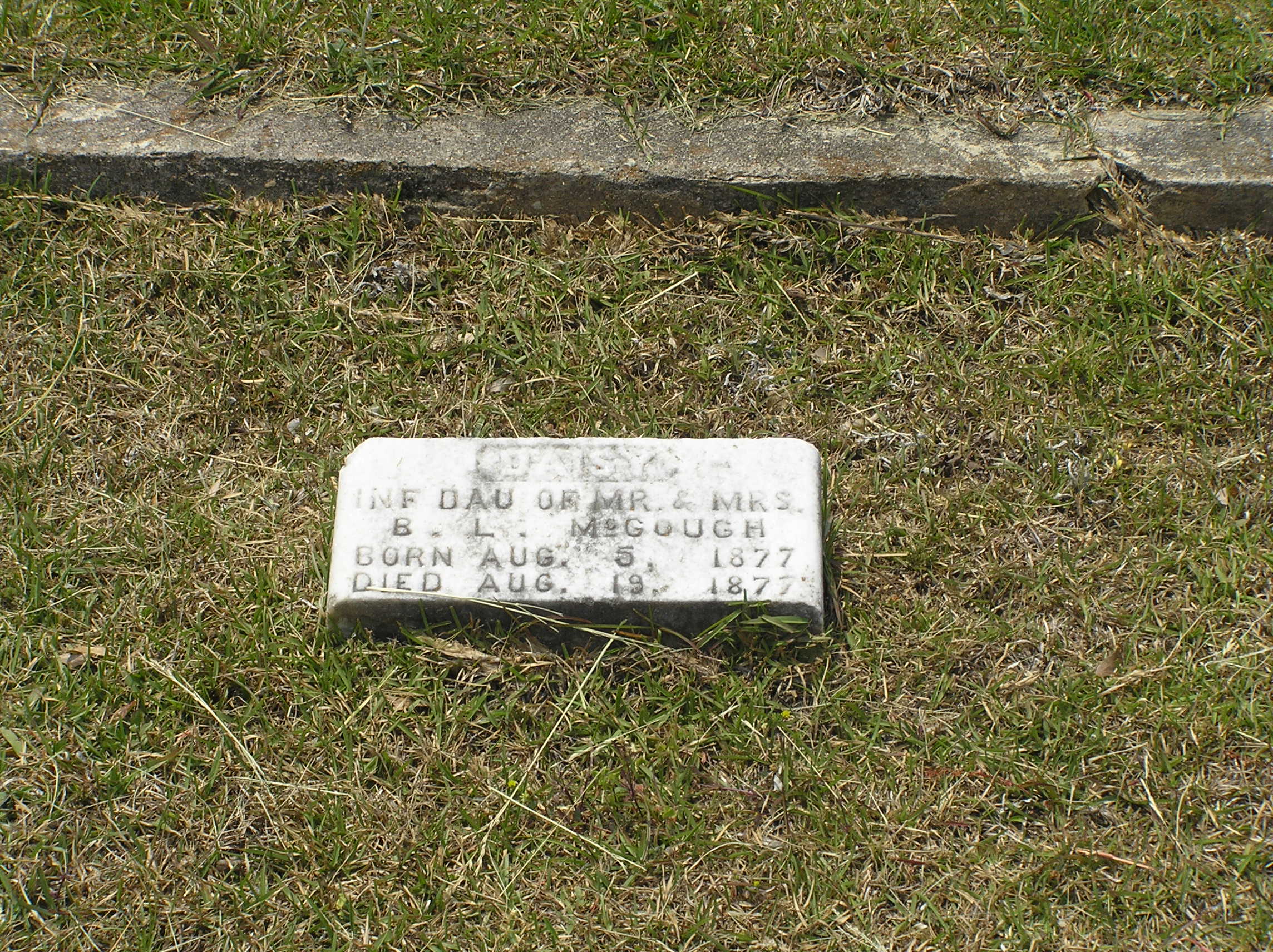 Daisy McGough, Inf Dau of Mr. & Mrs. B. L. McGough b. 05 Aug 1877 d. 19 Aug 1877 |
