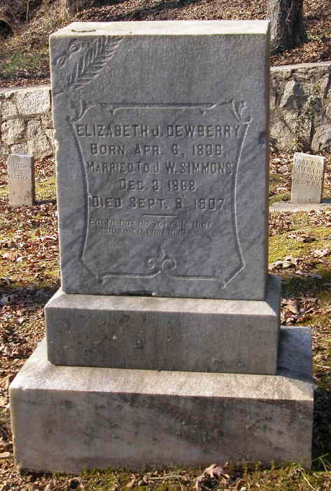 Elizabeth J. Dewberry Born April 6, 1836 Married to J. W. Simmons December 3, 1868 Died September 9, 1907 6565656 Earth has no sorrow that heaven can not heal.