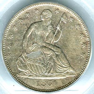 The 1861-O Half Dollar was minted under three different governments in the same year. The New Orleans Mint began the year 1861 by producing 330,000 halves as a branch mint of the United States. On January 26th, 1861, the State of Louisiana seceded from the Union and the Mint, along with nearly $5,000,000.00 in silver and gold, was seized by Lousiana militia on Jan. 31, 1861. The Mint personnel were forced to strike silver half dollars and $20 gold coins using the existing U.S. coinage dies that were on hand. During the State of Louisiana's brief control of the Mint, another 1,240,000 half dollars were struck for their government. Louisiana turned over the Mint to the Confederate central government on Feb. 28, 1861. An additional 962,633 half dollars were minted under CSA control. The coin dies that were used by the 3 different governments were never altered and the combined total of 2,532,633 half dollars are indistinguishable from one another. In April 1861, Confederate Secretary of the Treasury, Christopher Memminger, issued orders that new designs for half-dollars should be submitted to him for approval. Among several sent, the one approved bore on the obverse of the coin a representation of the Goddess of Liberty, surrounded by thirteen stars, denoting the thirteen States from whence the Confederacy sprung, and on the lower rim the figures, 1861. On the reverse there is a shield with seven stars, representing the seceding States; above the shield is a liberty-cap, and entwined around it stalks of sugar cane and cotton, "Confederate State of America." The dies were engraved by A. H. M. Peterson. They were prepared for the coining press by Conrad Schmidt, foreman of the coining room, from which four pieces only were struck. The Mint was closed on April 30, 1861 by Sec. Memminger due to the difficulty of obtaining bullion. Of the 4 pieces minted, one was sent to the Confederate Government, presumably to President Jefferson Davis, one presented to Prof. Biddle, of the University of Louisiana, one sent to Dr. E. Ames of New Orleans, and one was kept by B.F. Taylor, Chief Coiner of the Confederate States Mint. The New Orleans Mint remained closed until coining began again in 1879. |
