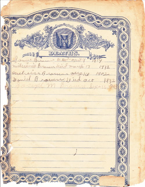 Deaths: James Brown died Apr 9, 1917; Milvinie Brown died 17 Mar 1932; Melvin Brown died Aug 16, 1902; Daniel Brown died Oct 1932; Joseph M Brown Sept 16, 1943. |