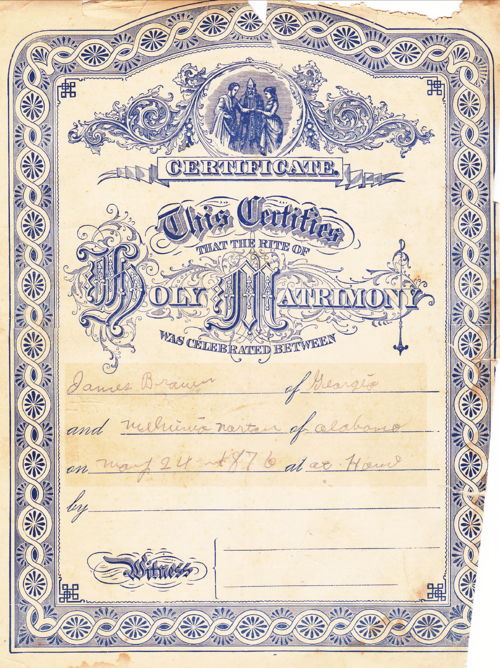 James Brown of Georgia and Melvinia Norton of Alabama, May 24, 1876 at home.