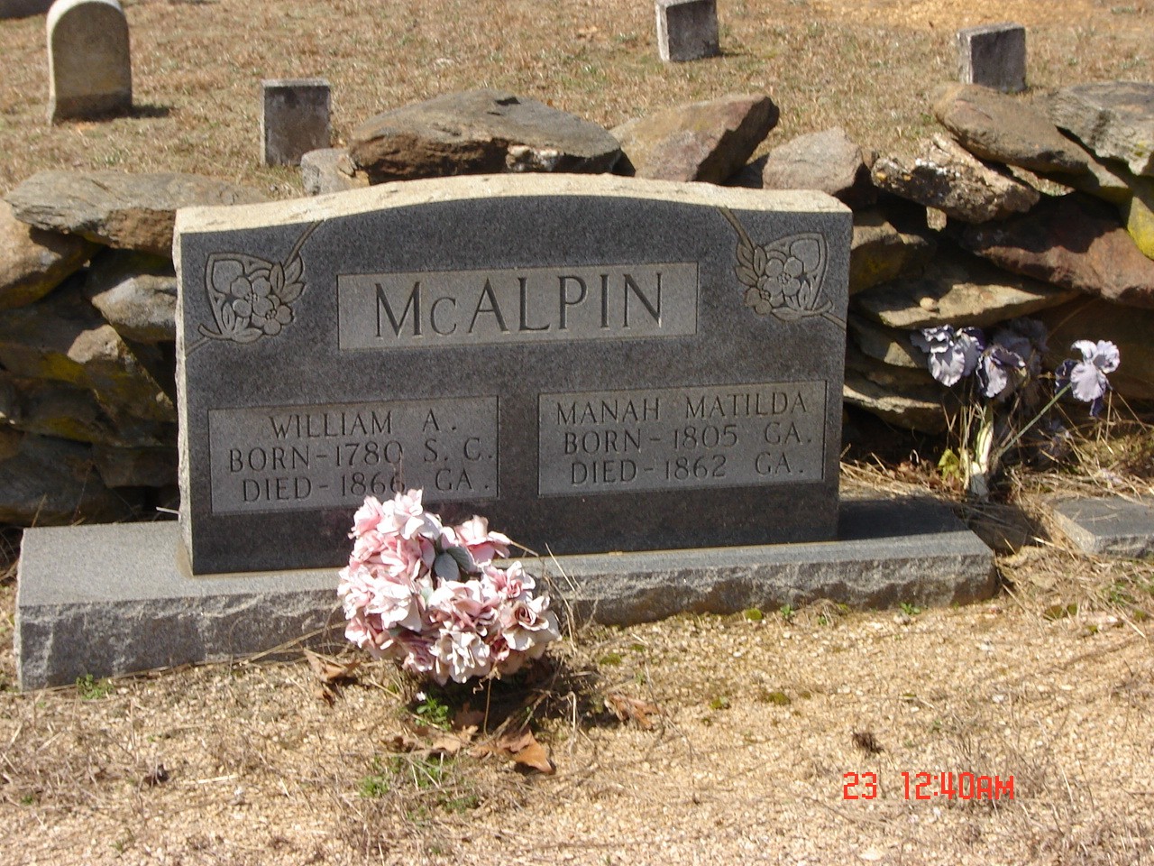 William A McAlpin, born 1780, died 1866; Manah Matilda McAlpin, born 1805, died 1862 |