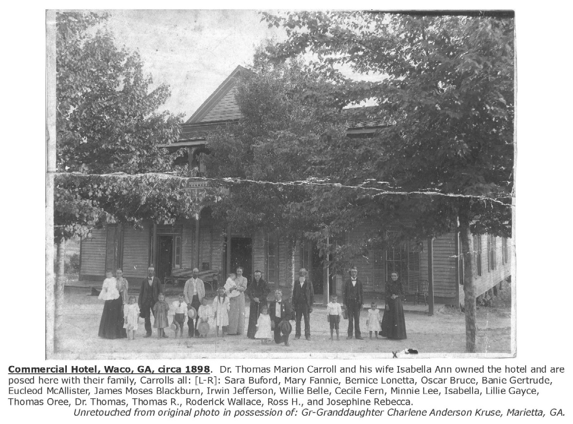 Commercial Hotel, Waco GA ca 1898; Dr Thomas Marion Carroll, Isabella Ann Carroll, Sarah Buford Carroll, Mary Fannie Carroll, Bernice Lonetta Carroll, oscar Bruce Carroll, Banie Gertrude Carroll, Eucleod McAllister Carroll, James moses Blackburn, Irwin Jefferson Carroll, Willie Belle Carroll, Cecile Fern Carroll, Minnie Lee Carroll, Lillie Gayce Carroll, Thomas Oree Carroll, Thomas R Carroll, Roderick Wallace Carroll, Ross H Carroll, Josephine Rebecca Carroll. |