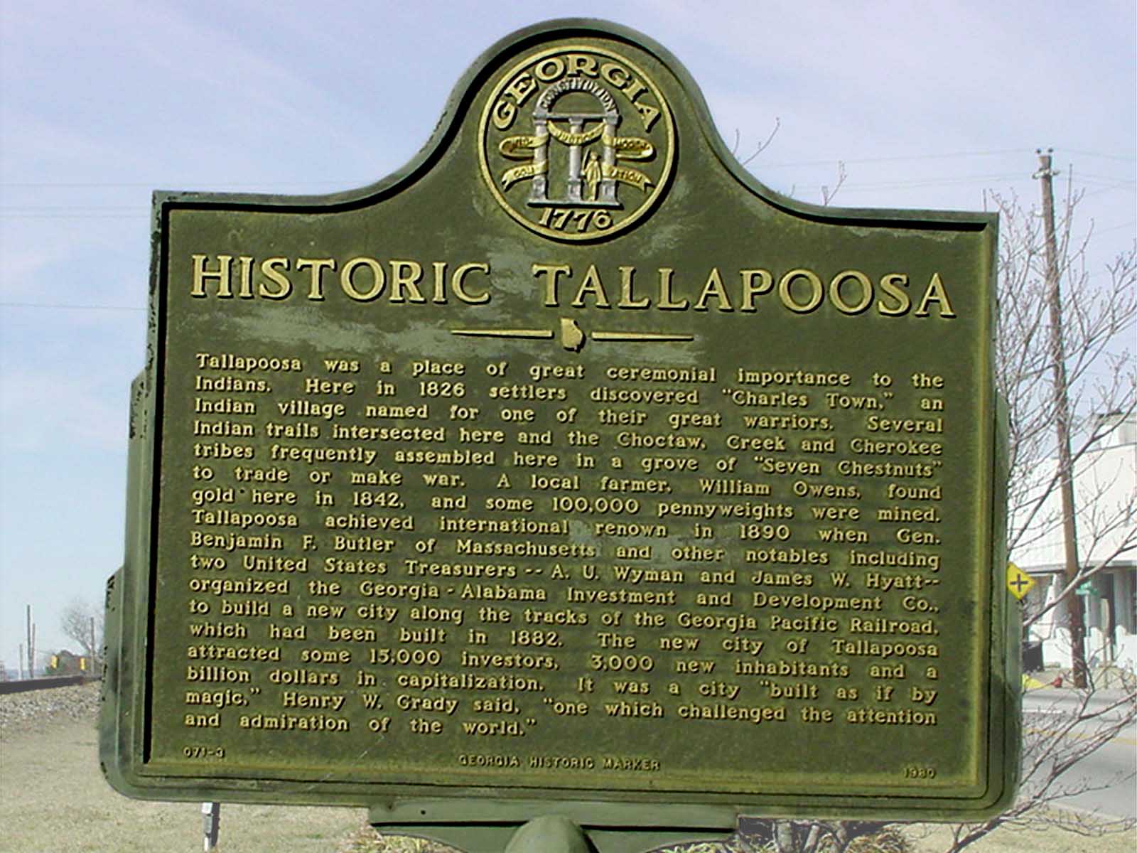 Tallapoosa was a place of great ceremonial importance to the Indians. Here in 1826 settlers discovered "Charles Town", an Indian village named for one of their great warriors. Several Indian trails intersected here and the Choctaw, Creek and Cherokee tribes frequently assembled here in a grove of "Seven Chestnuts" to trade or to make war. A local farmer, William Owens, found gold here in 1842. and some 100,000 pennyweights were mined. Tallapoosa achieved internation renown in 1890 when Gen. Benjamin F. Butler of Massachusetts and other notables including two United States Treasurers....A. U. Wyman and James W. Hyatt--organized the Georgia-Alabama investment and Development Co., to build a new city along the tracks of the Georgia Pacific Railroad, which had been built in 1882. The new city of Tallapoosa attracted some 15,000 investors, 3000 new inhabitants and a billion dollars in capitalization. It was a city "built as if by magic," Henry W. Grady said: "One which challenged the attention and admiration of the world. |