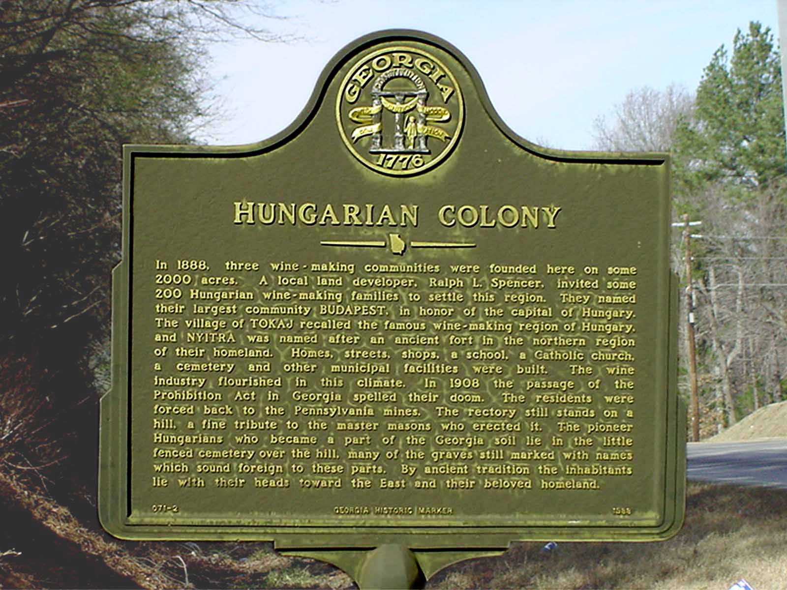 In 1888, three winemaking communities were founded here on some 2000 acres. A local land developer, Ralph L. Spencer, invited some 200 Hungarian wine-making families to settle this region. They named their largest community BUDAPEST, in honor of the capital of Hungary. The village of TOKAJ recalled the famous wine-making region of Hungary, and NYITRA was named after an ancient fort in the northern region of their homeland. Homes, streets, shops, a school, a Catholic church, a cemetery and other municipal facilites were built. The wine industry flourished in this climate. In 1908 the passage of the Prohibition Act in Georgia spelled their doom. The residents were forced back to the Pennsylvania mines. The rectory still stands on a hill, a fine tribute to the master masons who erected it. The pioneer Hungarians who became a part of the Georgia soil lie in the little fenced cemetery over the hill, many graves still marked with names which sound foreign to these parts. By ancient tradition the inhabitants lie with their heads toward the East and their beloved homeland. |