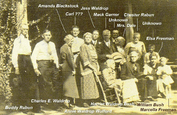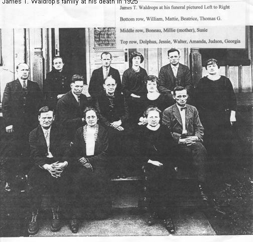 James Waldrop Family at his death in 1926; Brother of Harriet Waldrop Bush, William Carol and Henry Clay Waldrop. Arrived Haralson Co ca 1850. Submitted by Roy SIngleton |