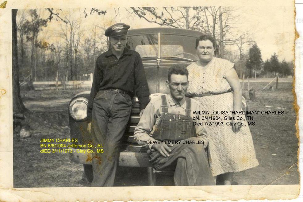 Jimmy Charles (born 1904; Jefferson Co AL, died 3-11-1973, Clay Co MS), Dewey Emery Charles; William Louisa Hardiman Charles (born 3-4-1904, Giles Co TN; died 7-2-1993, Clay Co MS), Contributed by William Latham Jr. |