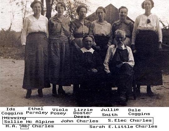 Charles Family. Ida Coggins; Ethel Parmley, Viola Posey; Lizzie Doster Deese; Jullie Smith; Dale Coggins; Sallie McAlpine; John Charles; S Elec Charles; H A "Ab" Charles; Sarah E Little Charles |