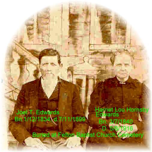 Joel T Edwards, born 1-12-1834; died 7-11-1899; Harriet Lou Edwards, born 3-7-1840; died 8-8-1916. Buried at Felton Baptist Church. Submitted by Mary Harper. |