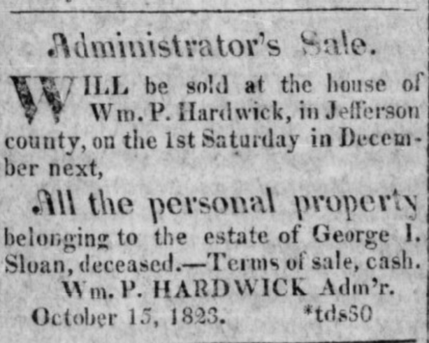 WILL be sold at the house of Wm P Hardwick, in Jefferson county, on the 1st