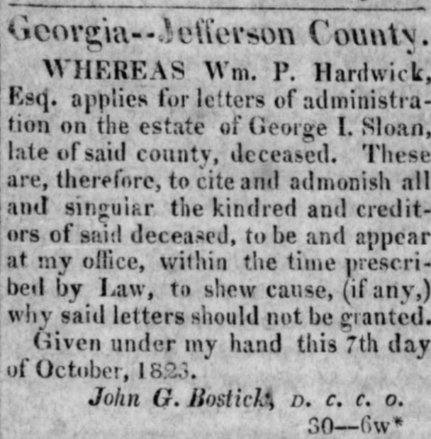 Georgia--Jefferson County. WHEREAS Wm. P. Hardwick, Esq. applies for letters