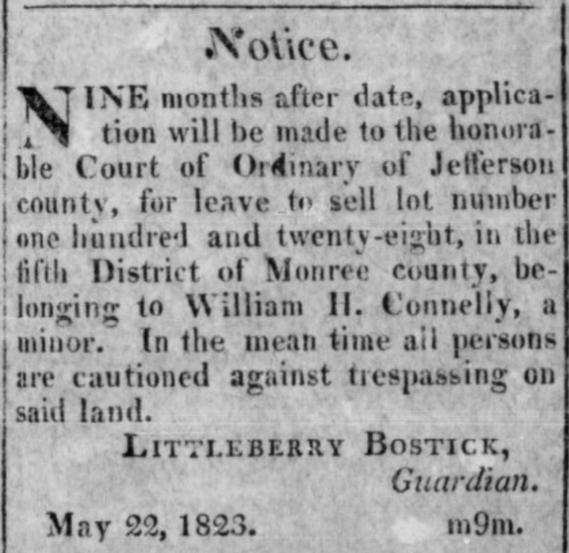 trespassing on said land. LITTLEBERRY BOSTICK, Guardian. May 22, 1823.