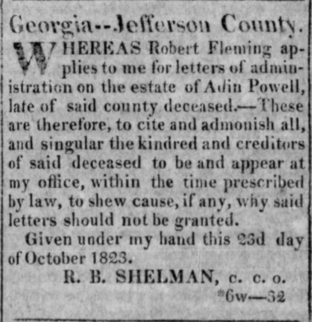 Georgia--Jefferson County WHEREAS Robert Fleming applies to me for letters of
