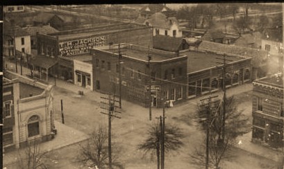 Wrightsville, ca 1915, Intersection of Marcus and Elm Streets before they were paved. Wrightsville was named for John B Wright, an early senator from 1857-1861. The site was chosen where two wagon roads crossed. The 78 and 4/10 acres of land for the town was donated by William P Hicks. |