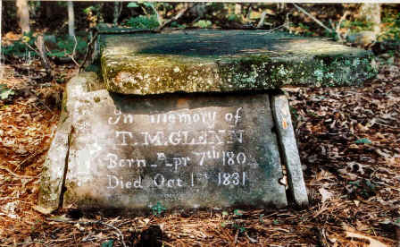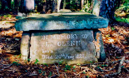 The John Glenn family cemetery is located in the Glade District of Oglethorpe County, on a small hill in the woods off of North Eades Road. The 8 box-type tombs were referred to as "wolf boxes" by the early settlers, as they were erected over the burial site to prevent wolves from digging up the graves. Some of the box tombs, including one of a child, have collapsed, and their inscriptions can no longer be read. There are also several slab markers and upright headstones. Numerous unidentified graves, some marked with field stones and small wooden markers, are evident. The cemetery is listed in Cemeteries of Oglethorpe County, Georgia and several other publications.