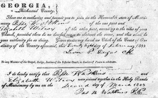 | WATKINS, Barbara | Larkin B. ROBERTS | 08 Sept 1842 | Book B Pg. 160; Some Georgia County