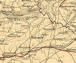 Community in the north eastern part of Talbot County, shown on an 1899 map. Approximately 9 miles northeast of Talbotton, one of the oldest