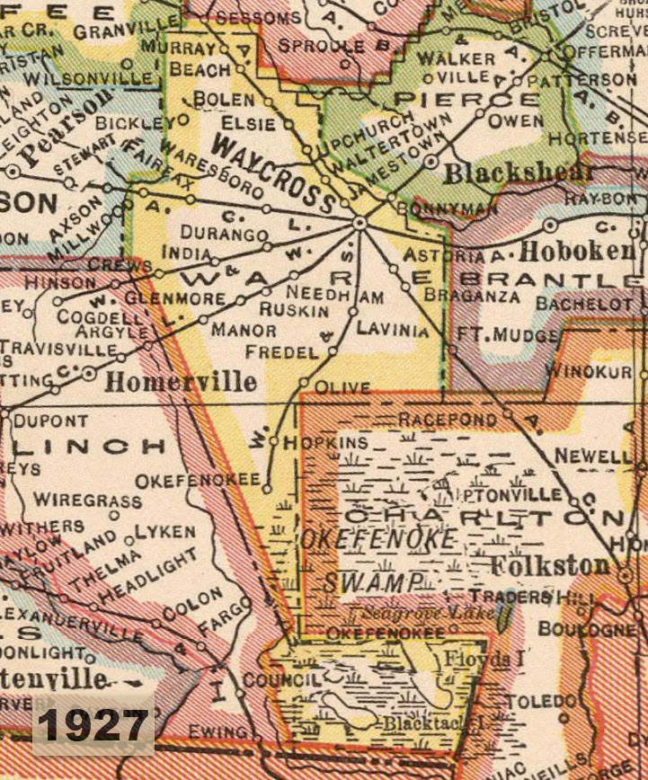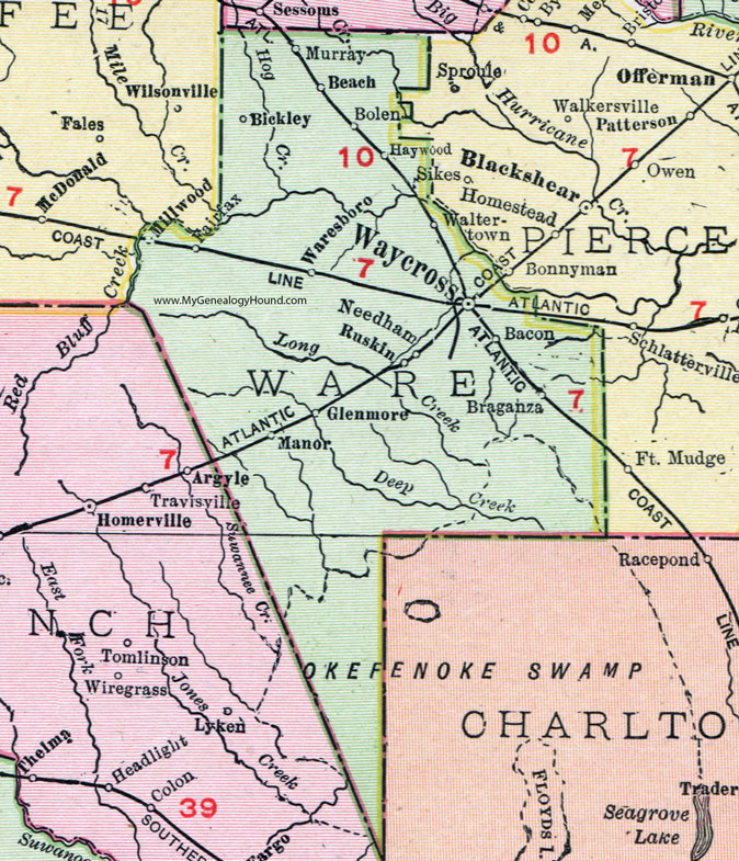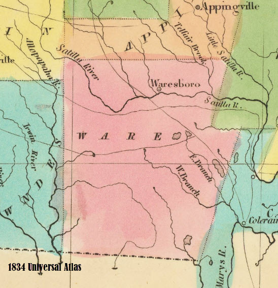 Georgia was a British Colony. In 1824, Ware County was formed from Appling County. In 1818, Appling County formed in 1818 from land ceded by the Creek Indians in the Treaty of Fort Jackson in 1814 and the Treaty of the Creek Agency in 1818.Children of Ware County