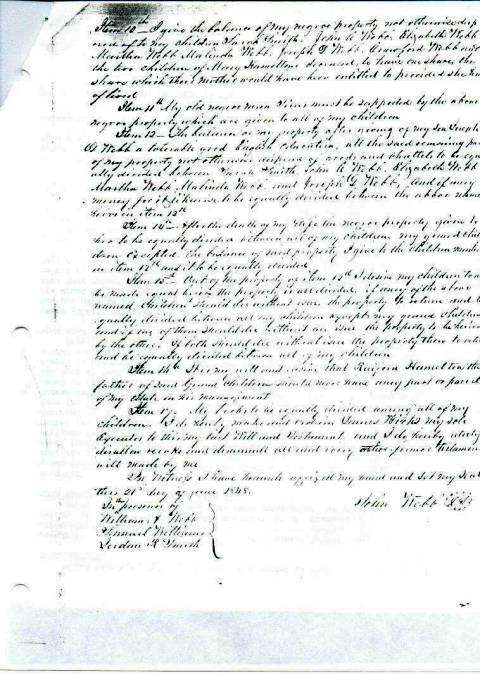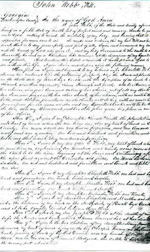 John Driver Webb Last Will and Testament, 1848Source: Sue Webb Last Will and Testament of John Driver Webb Georgia, Washington County. In the name of God Amen. I John Webb of the state and county aforementioned being in a feble state of health but of perfect mind and memory, thanks be given unto God, calling to mind, the mortality of my body and knowing that it is appointed for men to die do make and ordain this my last Will and Testament, that is to say princepally and first of all, I give and recommend my soul unto the hands of God who gave it and my body I recommend to the earth to be decently buried in a Christian like manner at the decisions of my Executor and friends. And concerning this estate wherewith it has pleased God to help me with in this life, I give, devise and dispose of in the following manner. Item First - I give a bequeath to my beloved wife Charlotte Webb, during her natural life the following property, the house and plantation on the south side of Buck Eye creek with the exception of 200 land, to be cleared, also three negros slaves, Simon, Hannah and Jacob. Also two horses, of her choice, also four cows and calves of her choice, out of all my stocks also two sows and piggs with ten others of her choice, with as mutch household and kitchen furniture as she thinks will do her, with as mutch provisions for one year as she and my Executor thinks will take to do her, also my horse cart and two sets plow gear, six plows in of her choice. Item 2nd - I give to my daughter Sarah Smith the plantation and tract of land which she now has in possesion and one cow and calf and one yearling, one bed and bedstead and furniture and table and slab which they now have in possesion. Item 3rd - I give to my son John C. Webb my tract of land where he now lives on, containing one hundred and ninety acres more or less, the creek to be the line, beginning at the lower and continuing up to the upper part against the Covington old field, One horse briddle and saddle, one bed and bedstead and furniture and trunk and table. Item 4th - I give to my daughter Elizabeth Webb one bed and bedstead and furniture, one trunk, bridle and saddle. Item 5th - I give to my daughter Martha Webb, one bed and bedstead and furniture, one trunk, bridle and saddle. Item 6th - I give to my daughter Malinda Webb one trunk. Item 7th - I give to my daughters Elizabeth and Martha and Malinda the balance of my lands on the north side of Buck Eye creek and it to be equally divided between them three. Item 8th - I give to my son Joseph D Webb at the death of my wife the house and land which I have bound her at her death. Item 9th - I give to the two children of my daughter Mary Hamilton deceased my tract of land lying on the Big Okoopie known as the Luision tract joining of lands of Ezekiel Daniel. Also my bunch of cattle that there, now in the care of Samuel Bedgood, the cattle to be sold and the money put at interest. Item 10th - I give the balance of my negro property not otherwise disposed of to my children Sarah Smith, John C Webb, Elizabeth Webb, Martha Webb, Malinda Webb, Joseph D Webb, Crawford Webb and the two children of Mary Hamilton deceased to have one share, the share their mother would have been entitled to provided she had lived. Item 11th - My old negro man Sims must be supported by the above negro property which are given to all of my children. Item 12 - The balance of my property after giving of my son Joseph D Webb a tolerable good English education, all the said remaining parts of my property not otherwise disposed of, goods and chattel, to be equally divided between Sarah Smith, John C Webb, Elizabeth Webb, Martha Webb, Malinda Webb and Joseph D Webb, and if any money for it likewise to be equally divided between the above named heirs in item 12th. Item 14th - After the death of my wife the negro property given to her to be equally divided between all of my children, my grandchildren excepted. the balance of said property I give to the children mentioned in item 12th and it to be equally divided. Item 15th - Out of the property of item 12th I desire my children to all be made equal before the property is all divided. If any of the above named children should die without issue, the property to return and be equally divided between all my children except my grand children and if one of them should die without issue the property to be held by the other. If both should die without issue the property then to return and be equally divided between all of my children. Item 16th - It is my will and desire that Raiford Hamilton the father of said grand children should never have any part or parcel of my estate in his management. Item 17 - My books to be equally divided among all my children. I do hereby make and ordain James Hicks my sole Executor to this my last will and Testament and I do hereby uterly disallow and revoke and denounce all and every other former Testament Will made by me. In witness I have herewith affixed my hand and set my seal this 21st day of June 1848. John Webb (seal) In the presence of: |