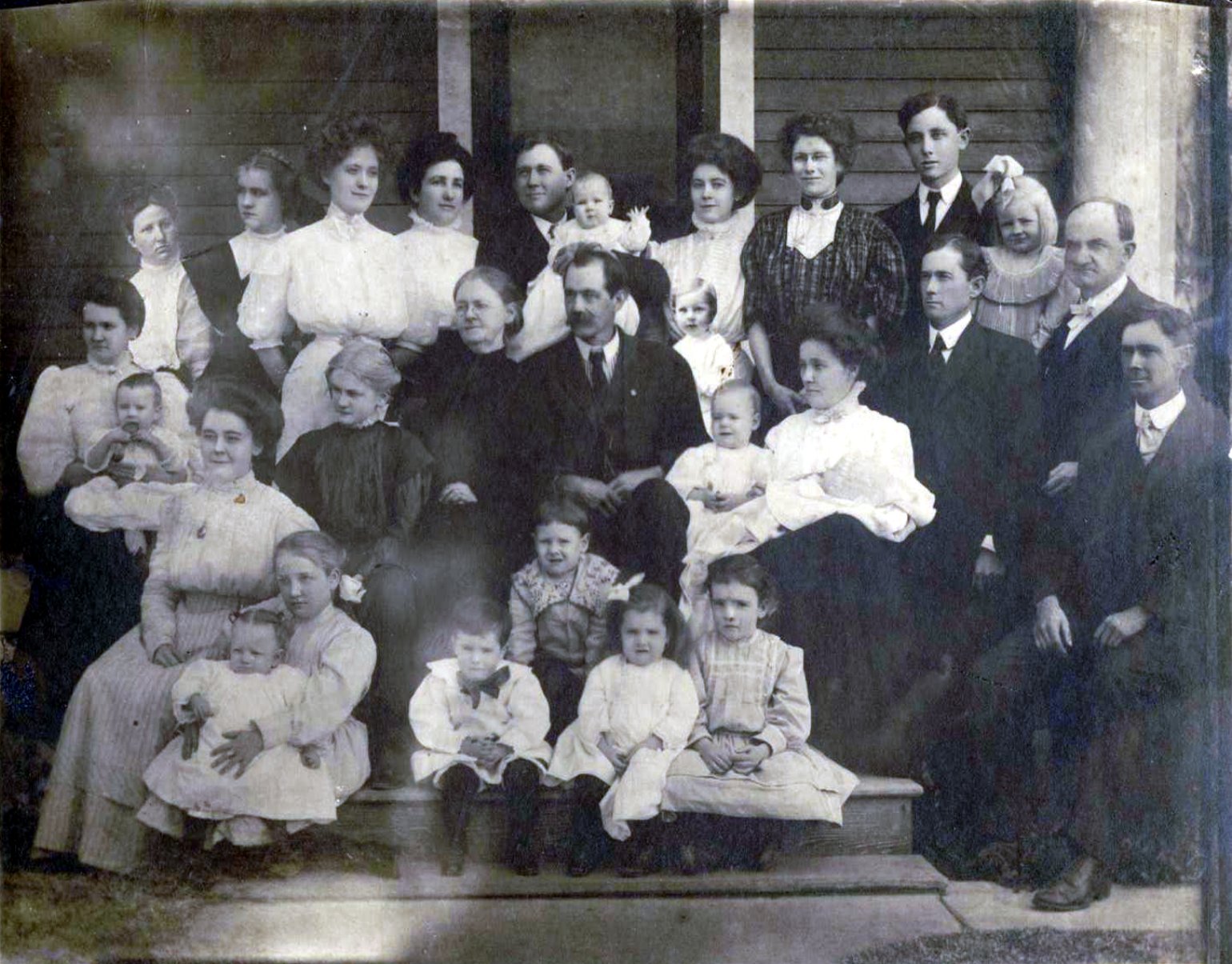 Middle Row: Mrs. Ben Medley (Lucy), Martha Medley ( Mrs. Chris Wegner), Maggie Robins (Mrs. H. E. Newton), Lois Goddard ( Mrs. Dale Morrison) , Mrs. Wm. Elias (Elizabeth Sloan) Robins, William Elias Robins, Murriel Robins, Delbert Robins, Mrs Oscar E. Goddard (Leila)-Holding Infant Virginia Goddard, William Hollingsworth Robins, Elizabeth Goddard, Oscar E. Goddard, Charles Thomas Robins