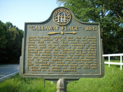Text: Jesse Callaway, soldier of 1812, son of Joseph Callaway, soldier of '76, lived in this house from 1852 to 1867. The house, built with bricks made on the place, remained in the family until after 1900. It is said to have been built about 1814. Callaway, born in Wilkes County in 1796, was a Sergeant in Capt Jones Co, Col Booth's Regiment GA Militia 1814-15. He was married 4 times and had 18 children, most of them having living descendants in GA. Deeding this house to his son John in 1867, he moved to another house on his land 2 miles north, where he died in 1875 and is buried in a family cemetery.