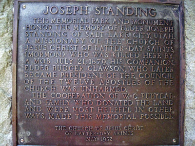 Rudger Clawson and Joseph Standing were proselyting Mormons who were in the Northern Georgia area. Several people were converted and according to an article in the Atlanta Constitution about 150 to 200 people total moved to Utah via train from North Georgia. Joseph Standing, a young man of 23 years of age, was the Presiding Elder of the Georgia Conference, which covered several congregations of that area. Apparently they were well received in most areas except for Varnell Station. On June 12, 1879, Joseph Standing wrote to the Governor of Georgia saying armed mobs numbering 40 or 50 were known to descend upon people who had converted to Mormonism in Varnell and suggested that nothing had been done about it by the local officers. He asked the Governor to write so the Ministers and converts would not have fear of being stoned or shot. He had a reply on 21 June 1879 from the Secretary of the Executive Dept, saying that the courts and jurors were there to decide if someone had committed a crime and the Governor was going to instruct the State Prosecuting Attorney for that district to inquire and prosecute if true. According to an article in the NY Times, some of the local people felt Mr. Standing had endangered the peace and integrity of the homes in the Varnell area. Joseph Standing and Rudger Clawson were on their way to a conference meeting in Rome when Mr. Standing was killed in Varnell, Whitfield Co, GA by a group of men on Sunday, July 21, 1879. Those who were accused, were put on trial and were acquited October 1879.