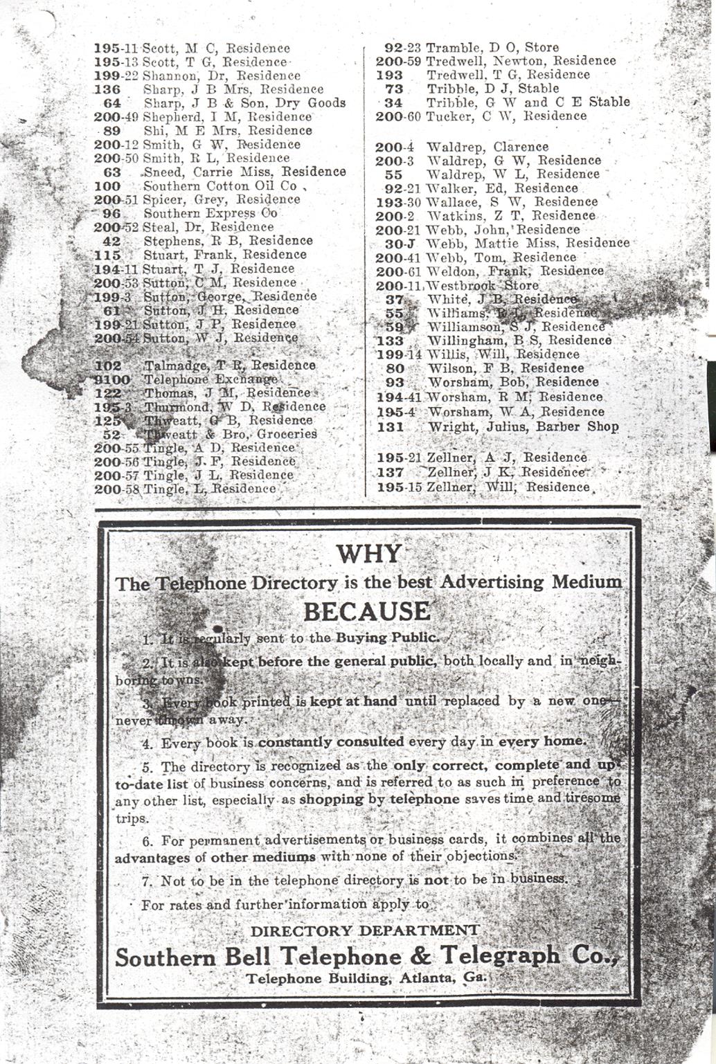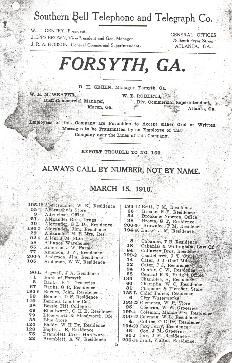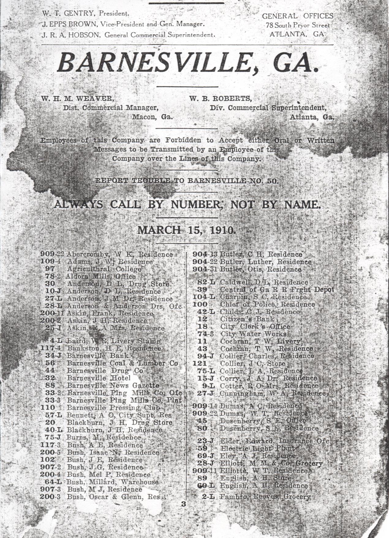 One of the many interesting objects in the Museum is a 1910 Official Telephone Directory of Southern Bell Telephone and Telegraph Co. for the cities of Barnesville and Forsyth, Ga.